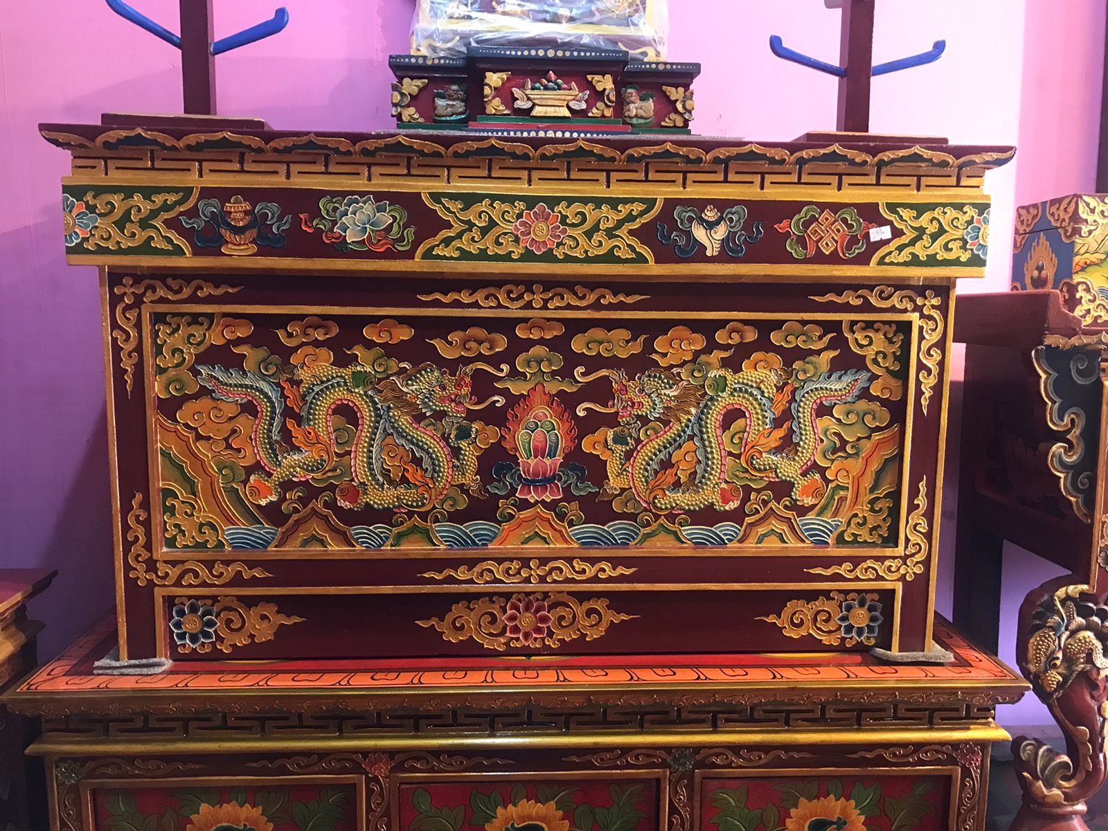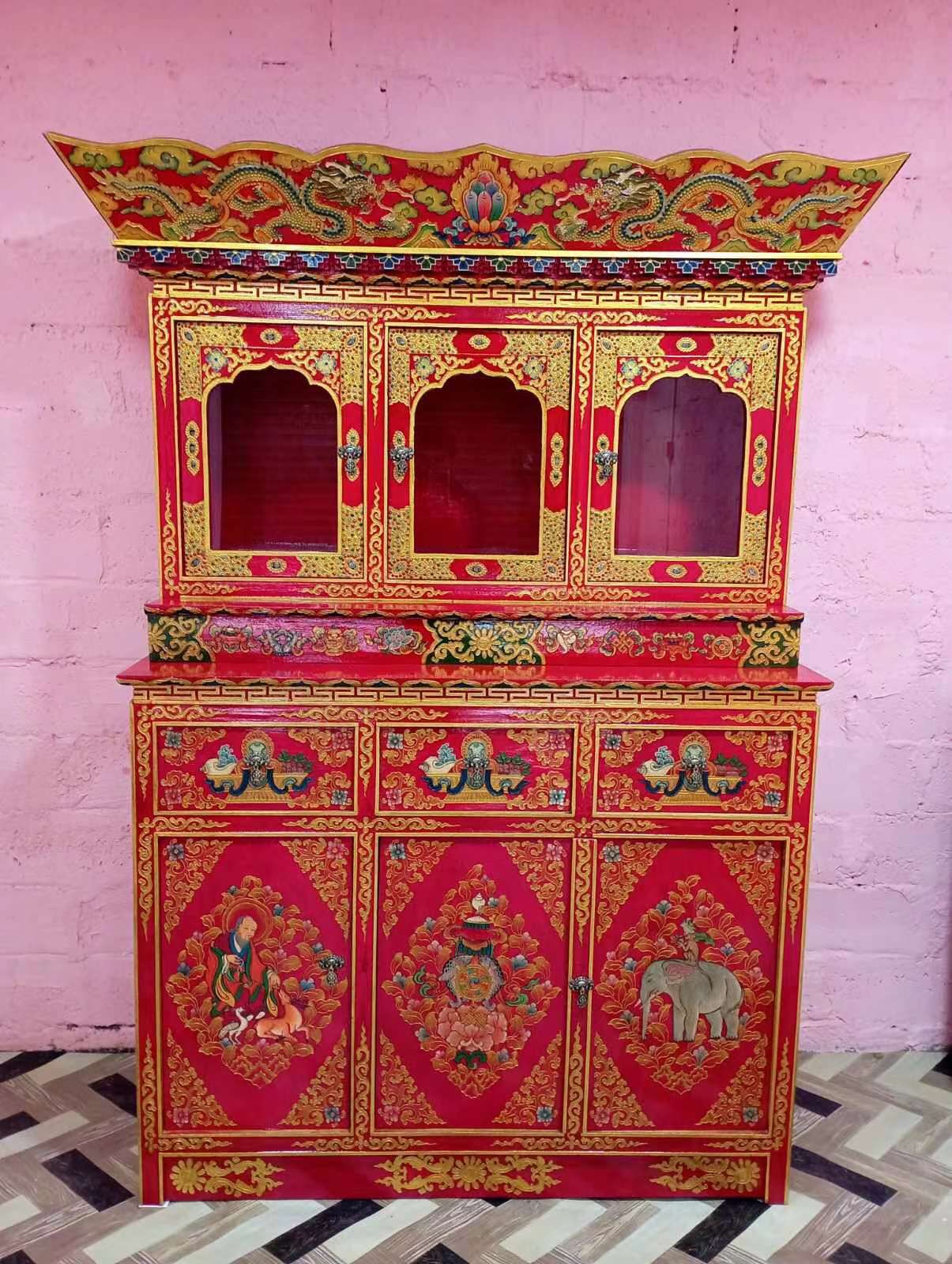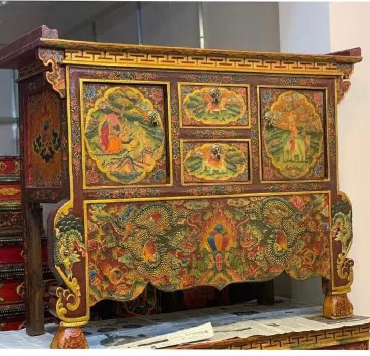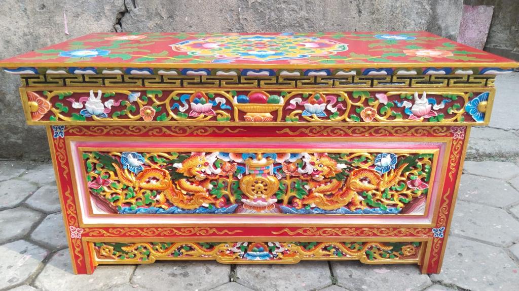 According to The Brief History, there was a record of engagement of carpenters to build the Jokhang Temple and Ramoche Temple in 6BC. Through thousands of years’ handworks of the people, furniture has become a unique style, which bears artistic shapes, rich colors, and delicate craft. Furniture is one of the greatest treasure which dates 1500 years back. These Furniture is mostly made up of pine and Himalayan softwoods i.e. Elm, Pine, Poplar, or Cedarwoods. Furniture comes in many designs. The furniture is mostly engraved with dragons, animals, images of deities, flowers, and religious symbols. In the context of today’s, Floral motifs, dragons, and chepaks (Nepali symbol) are very fashionable in terms of styles. Today the best color combination seems to be red background with designs in gold, blue and green. It all fits in perfectly with the entire aura of interiors furniture. Most of the furniture collected from houses are nearly or completely black in such an order that one cannot see the artwork behind the layers. This Furniture is special of three types: Cabinet, Table, Chest.